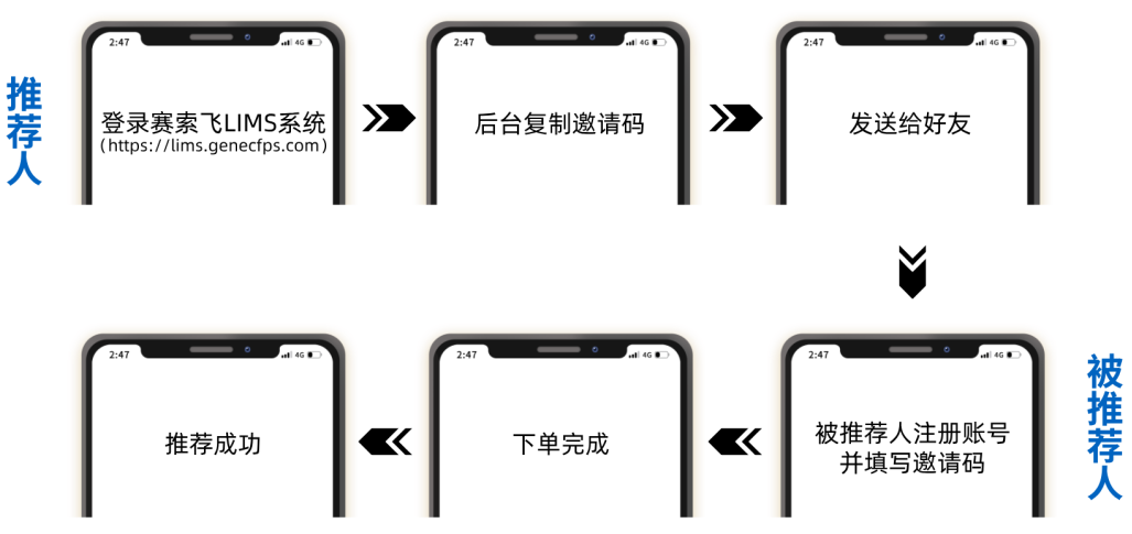 请根据以下流程,获取邀请码并分享给您的朋友,被推荐人成功下单,双方均可获得相应奖励。