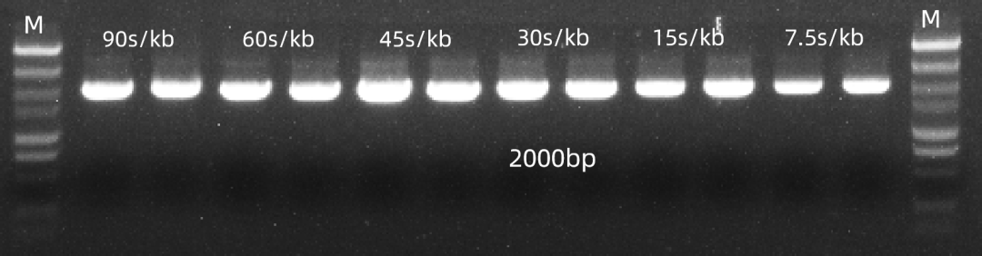图1. Hi-FiGuard DNA Polymerase在不同延伸时间(90、60、45、30、15、7.5 s/kb)条件下扩增λDNA(2000 bp)的结果。PCR反应共进行25个循环,在所有条件下均获得单一目标条带。