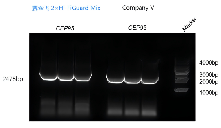 在CEP95(2475 bp)片段扩增实验中,赛索飞2×Hi-FiGuard Mix获得了清晰、完整的目标条带,背景干净。在相同PCR条件下,其目标条带亮度较V公司同类产品略有提升,体现出良好的扩增效率,适用于中长片段扩增应用。