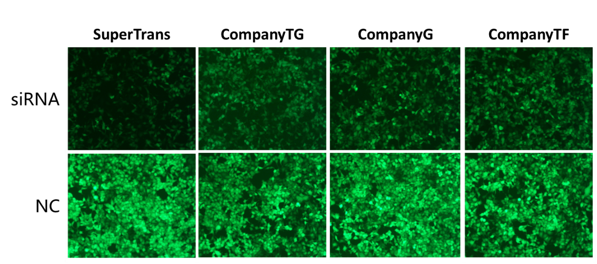 分别使用赛索飞SuperTrans和TransExp转染siRNA和NC质粒(NC质粒表达EGFP荧光蛋白),相比同类产品,在MCF7细胞中SuperTrans和TransExp在siRNA沉默EGFP实验中表现出更优的效果。
