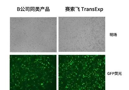 在Hela细胞中,分别使用赛索飞TransExp质粒DNA转染试剂与B公司同类产品进行GFP质粒的转染,48h在荧光显微镜下观察荧光效果。