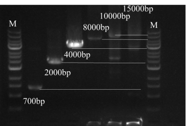 图1. 使用λDNA为模板,延伸时间45 s/kb,25个循环条件下,700、2000、4000及8000 bp片段均成功扩增,验证了2×Hi-FiGurad Mix在不同长度片段中的高效扩增性能。